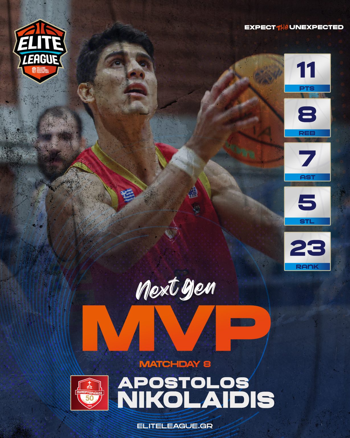 Πολυτιμότερος παίκτης κάτω των 23 ετών αναδείχθηκε για δεύτερη φορά τη φετινή σεζόν ο Απόστολος Νικολαΐδης κερδίζοντας το νεοσύστατο βραβείο MVP Next Gen. Ο 19χρονος γκαρντ στη νίκη του Πανερυθραϊκού επί της Νίκης Βόλου (83-90) συγκέντρωσε 23 βαθμούς στο σύστημα αξιολόγησης έχοντας 11 πόντους με 1/1 βολή, 2/6 δίποντα και 2/6 τρίποντα, μαζί με 8 ριμπάουντ, 7 ασίστ, 5 κλεψίματα και 3 κερδισμένα φάουλ σε 30:07.