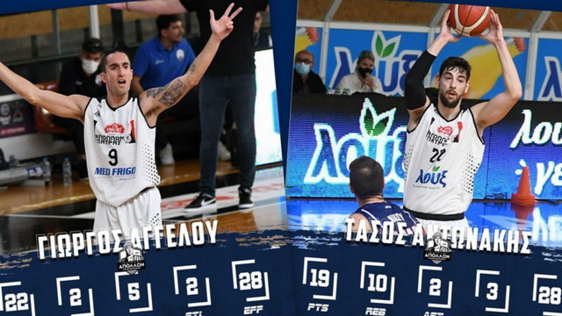 Έτσι, το βραβείο του MVP της πρεμιέρας του πρωταθλήματος, μοιράστηκαν οι Γιώργος Αγγέλου και Τάσος Αντωνάκης, με τους δύο παίκτες του Απόλλωνα Πάτρας να έχουν, ο μεν Αγγέλου σε 27’36’’ είχε 22 πόντους (4/4, 6/6), δύο ριμπάουντ, πέντε ασίστ, δύο κλεψίματα και 28 στο σύστημα αξιολόγησης, ο δε Αντωνάκης, σε 27’04’’ είχε 19 πόντους (3/5, 2/2, 4/7), δέκα ριμπάουντ, δύο ασίστ, τρία κλεψίματα, μία τάπα και επίσης 28 στο σύστημα αξιολόγησης.