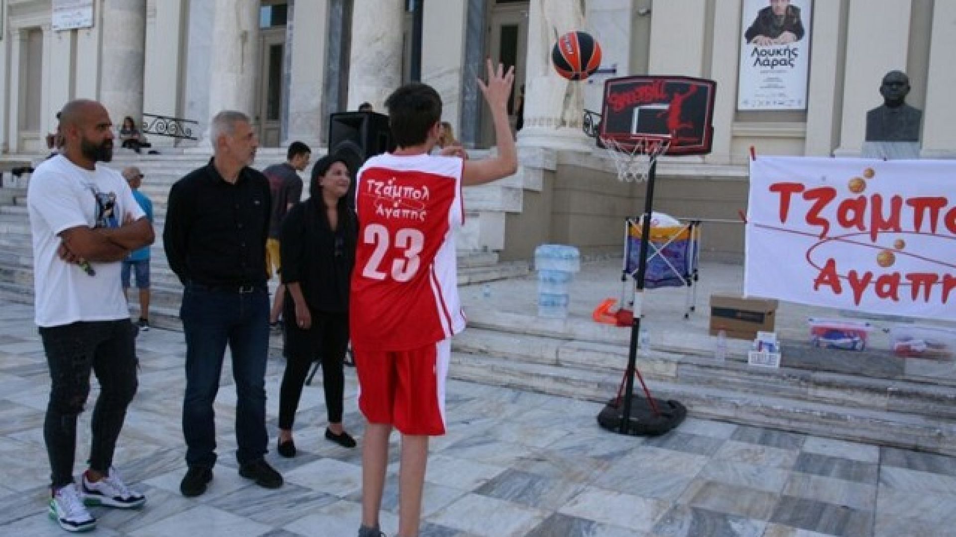 Το «Τζάμπολ Αγάπης» βρέθηκε στο κέντρο του Πειραιά, στο Δημοτικό Θέατρο, χάρη στη φιλοξενία του Ο.Π.Α.Ν. του Δήμου Πειραιά και του κ. Ιωσήφ Βουράκη, τον οποίο ευχαριστούμε πάρα πολύ. Το πρόγραμμα του «Τζάμπολ Αγάπης» αφορά την Ειδική Καλαθοσφαιρική Αγωγή, δηλαδή τη δυνατότητα που δίνουμε σε παιδιά των Ειδικών Σχολείων να παίξουν μπάσκετ μαζί με τα παιδιά των Γενικών Σχολείων, να τα ενώσουμε όλα σε μια αθλητική οικογένεια και καταργώντας κάθε διαφορετικότητα, να κάνουμε ένα βήμα για ένα καλύτερο μέλλον».