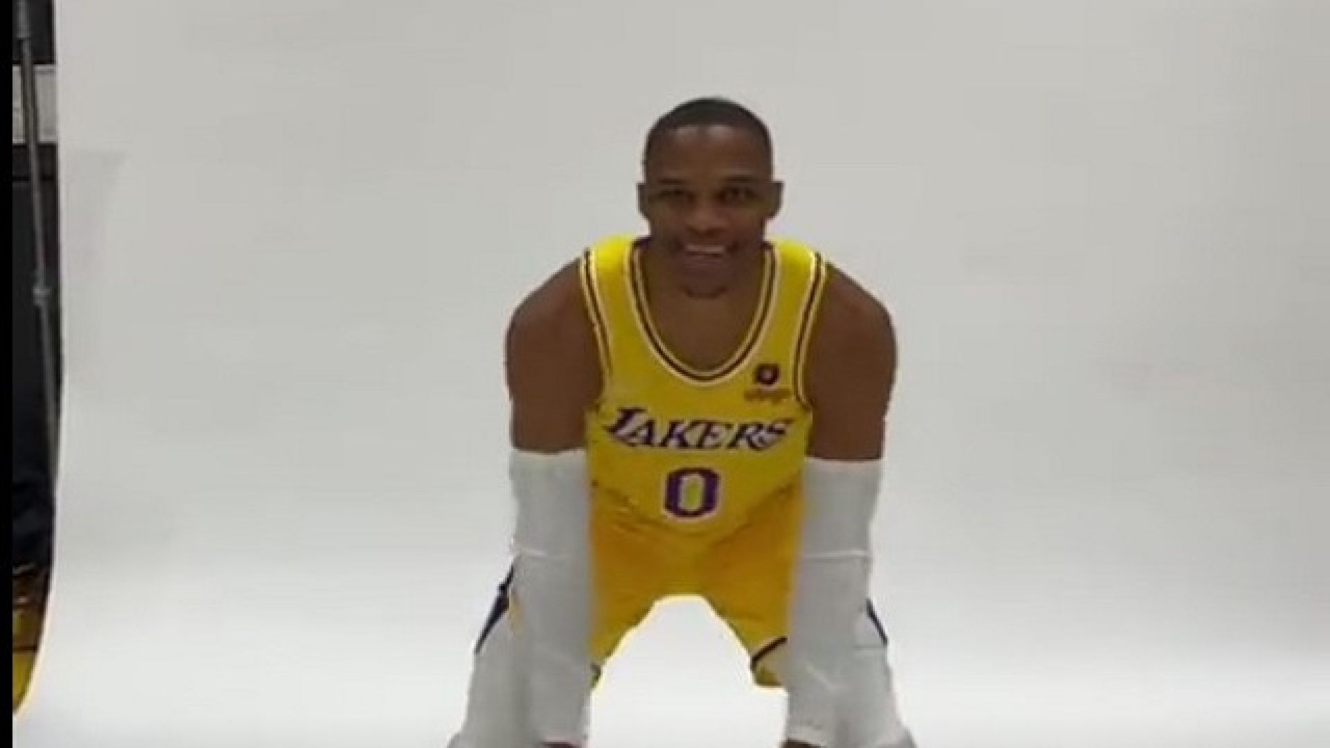 Ο Γουέστμπρουκ φάνηκε ιδιαίτερα χαρούμενος φορώντας τη φανέλα των Λέικερς, ποζάροντας με τους συμπαίκτες του στον φακό, με πλατύ χαμόγελο!