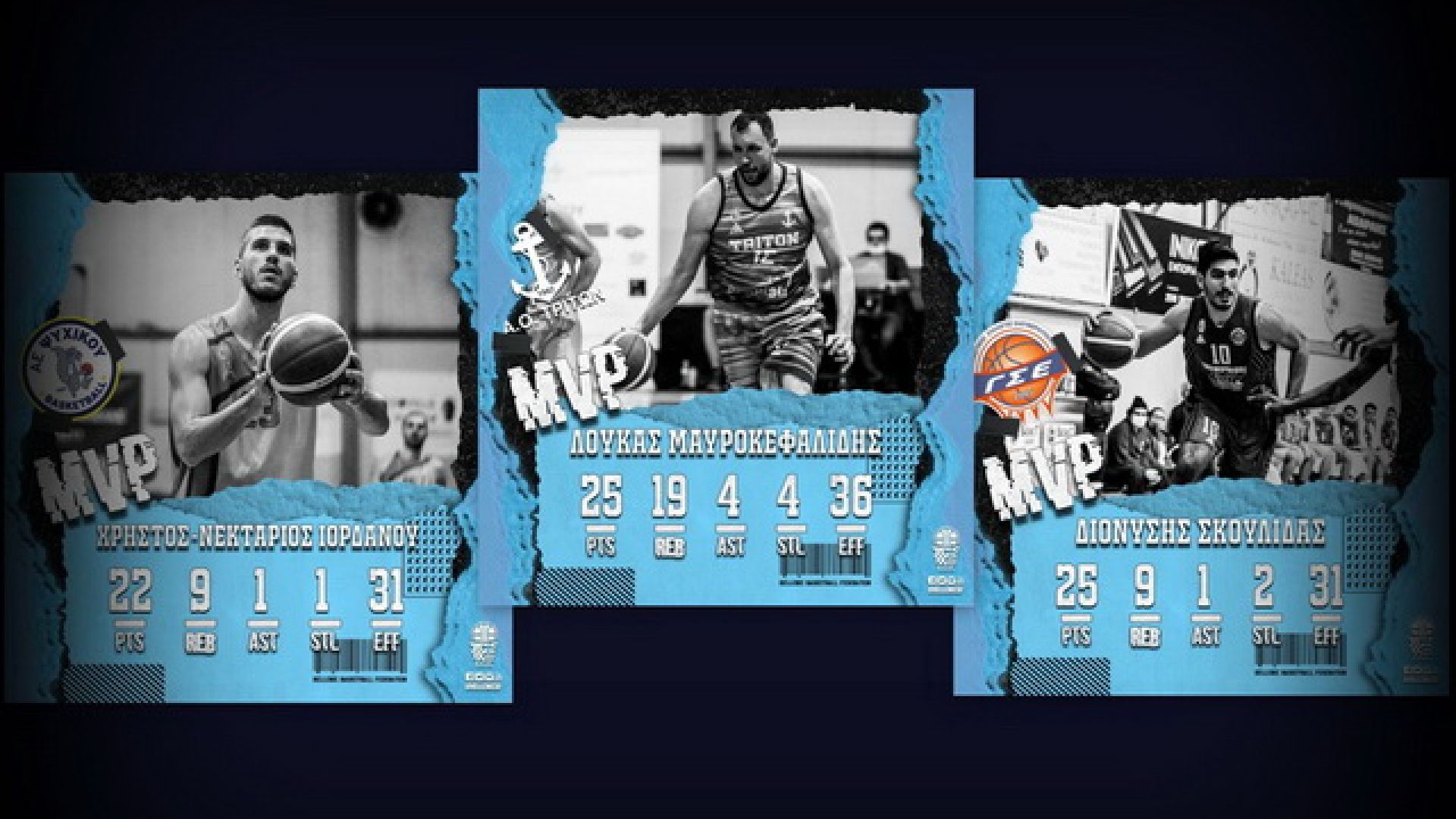 Όσον αφορά το βραβείο του MVP της 7ης αγωνιστικής, μοιράστηκε ανάμεσα στους Διονύση Σκουλίδα και Χρήστο Ιορδάνου, με τον πρώτο να έχει 25 πόντους με 5/11 τρίποντα και 9 ριμπάουντ σε 35’01’’, τον δεύτερο 22 πόντους με 7/8 δίποντα και 2/3 τρίποντα και 9 ριμπάουντ σε 33’10’’ και τους δύο μαζί να συγκεντρώνουν 31 βαθμούς στο σύστημα αξιολόγησης.