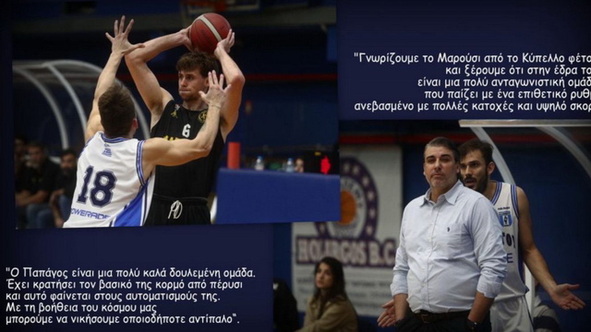Ο προπονητής του Παπάγου, Μιχάλης Κουρής, δήλωσε από την πλευρά του : “Γνωρίζουμε το Μαρούσι από το Κύπελλο φέτος και ξέρουμε ότι στην έδρα του είναι μια πολύ ανταγωνιστική ομάδα που παίζει με ένα επιθετικό ρυθμό ανεβασμένο με πολλές κατοχές και υψηλό σκορ. Είναι μια ομάδα που τους αρέσει να εκτελούν πολλά τρίποντα και βλέπουμε ότι έχουν τους παίκτες να το κάνουν από όλες τις θέσεις. Πρέπει να είμαστε συγκεντρωμένοι και σοβαροί 40 λεπτά σε μια δύσκολη έδρα σαν τον Αγ. Θωμά. Νομίζω έχουμε προετοιμαστεί κατάλληλα και εύχομαι να γίνει ένα ωραίο παιχνίδι και να γεμίσει το γήπεδο”.