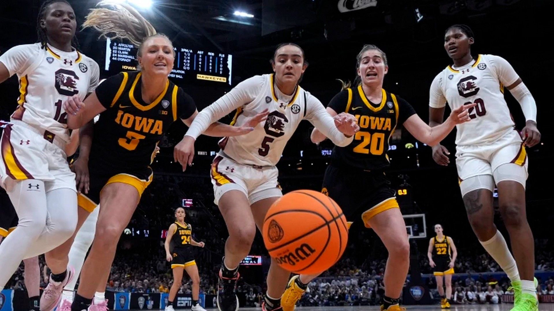 Η ομάδα του Ιαϊόβα με επιθετική αιχμή την Κάτλιν Κλαρκ ήταβν μπροστά στο σκορ στην πρώτη περίοδο, ωστόσο το Σάουθ Καρολάινα πήρε τα ηνία και έφτασε στο τελικό 87-75 έχοντας τον έλεγχο.