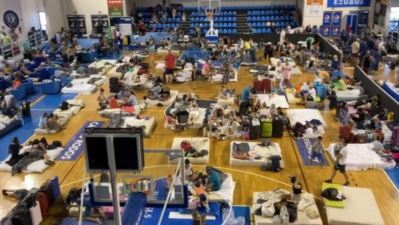 Οι καταστροφικές πυρκαγιές που μαστίζουν την Ρόδο οδήγησαν στην παραμονή πολλ΄ών ατόμων στο κλειστό γήπεδο της Καλλιθέας της Ροδου.