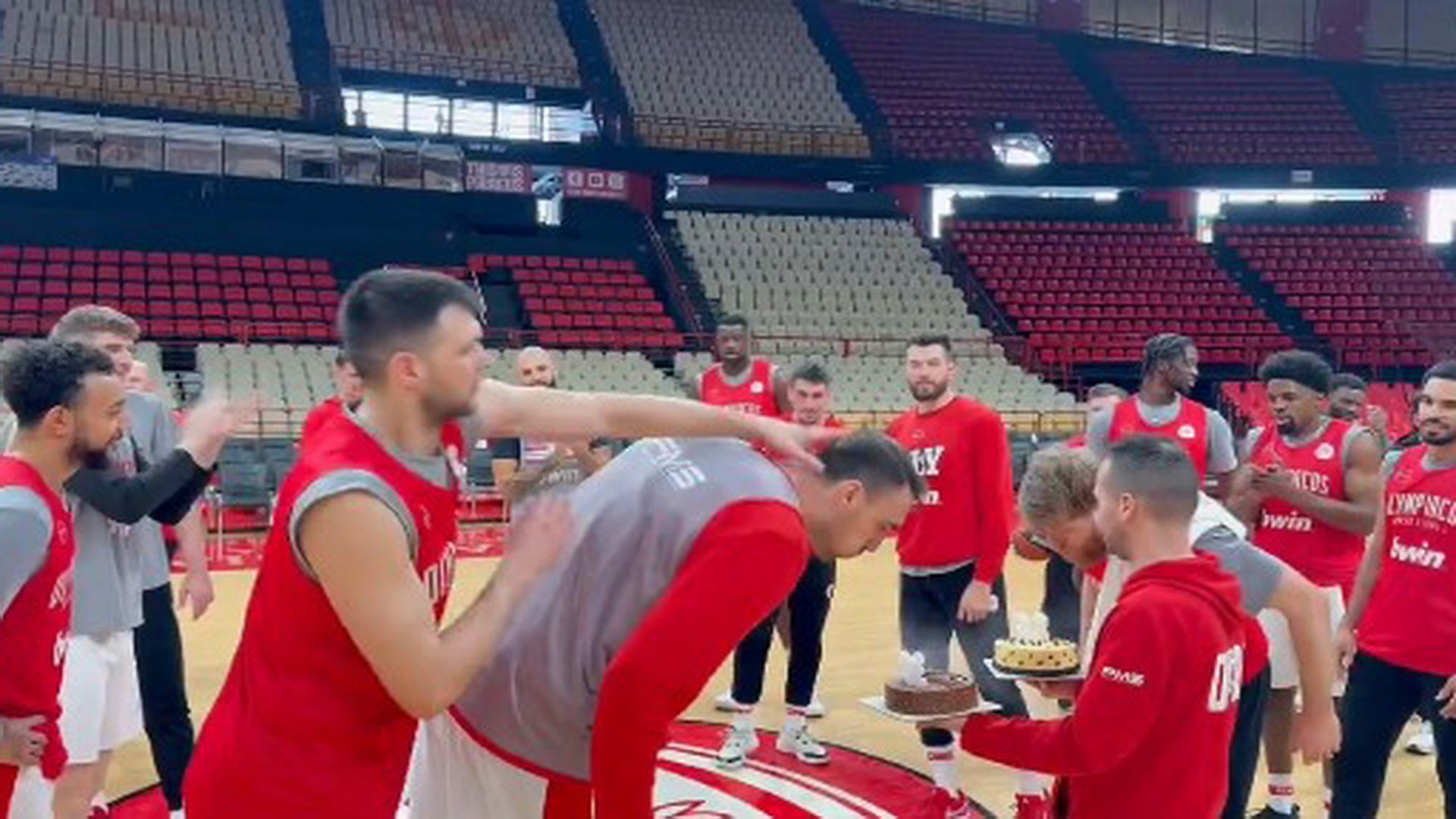 Έτσι, όχι μία, αλλά δύο τούρτες εμφανίστηκαν στο παρκέ τους ΣΕΦ, με τους συμπαίκτες των Μιλουτίνοβ και Γουόκαπ να τους τραγουδούν και το σχετικό τραγούδι.