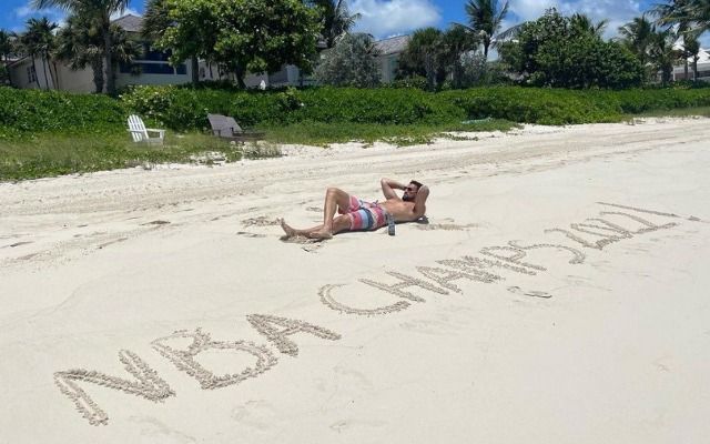 Ο Τόμπσον κάνει διακοπές στις Μπαχάμες και σε μια παραλία έγταψε στην άμμο, ότι έγινε πρωταθλητής του NBA .
