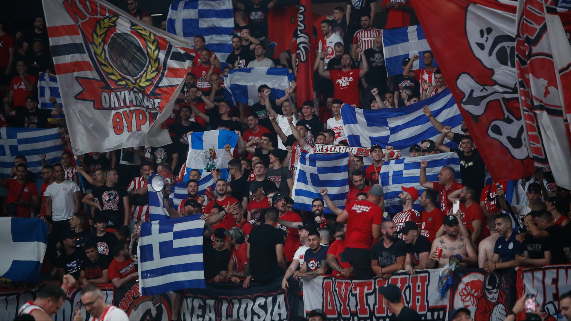Το Φαληρικό στάδιο γέμισε με ελληνικές σημαίες, καθώς οι φίλοι του Ολυμπιακού που βρίσκονται στον αγώνα έφεραν μαζί την γαλανόλευκη, δίνοντας όμορφο χρώμα στις εξέδρες.