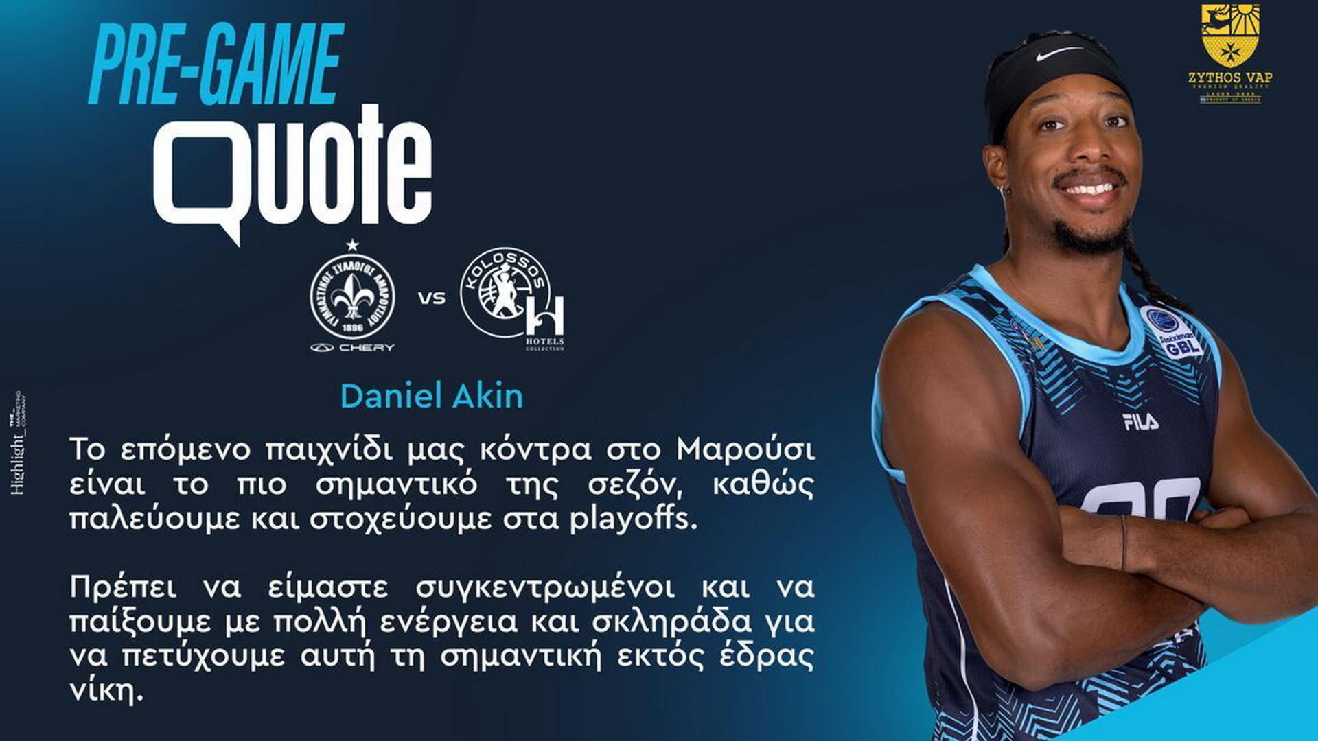 Στην σημασία της επερχόμενης αναμέτρησης του Κολοσσού με το Μαρούσι, αναφέρθηκε με δηλώσεις του ο Ντάνιελ Ακίν, στην επίσημη ιστοσελίδα της ομάδας της Ρόδου.