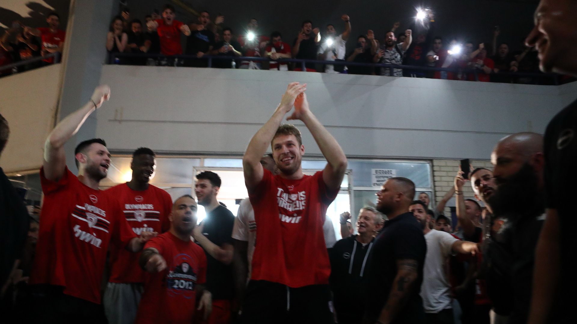 Ο Ολυμπιακός στέφθηκε πρωταθλητής Ελλάδας μέσα στο ΟΑΚΑ, με τον Γιώργο Μπαρτζώκα στα αποδυτήρια να συγχαίρει τους παίκτες του και τον Γιαννούλη Λαρεντζάκη να τρώει το καθιερωμένο… φατούρο, υπό τους ήχους του «είσαι στο μυαλό»
