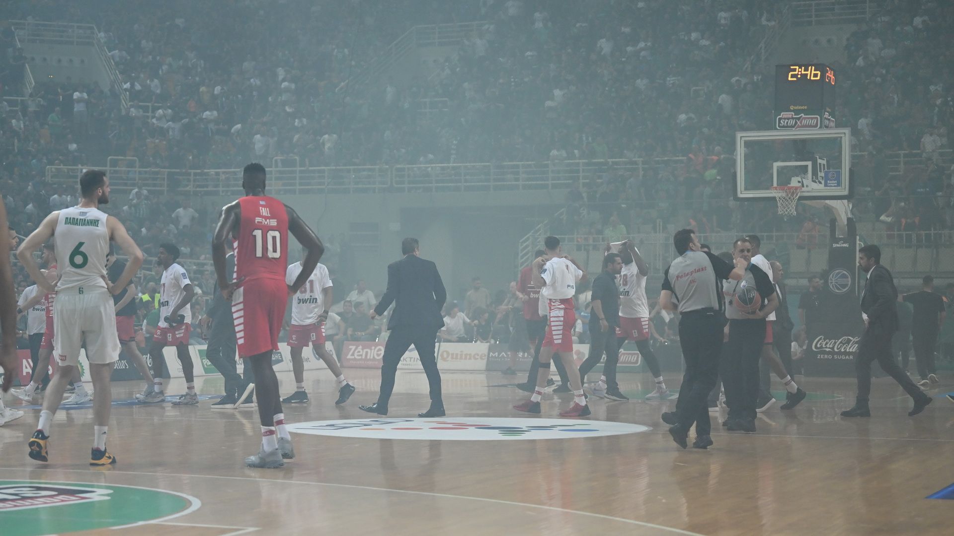Την προσωρινή διακοπή της αναμέτρησης, 2'46'' πριν το φινάλε του τρίτου δεκαλέπτου διέταξε η διαιτητική τριάδα, μετά την ρίξη καπνογόνων και αντικειμένων από πλευράς των οπαδών του Παναθηναϊκού.
