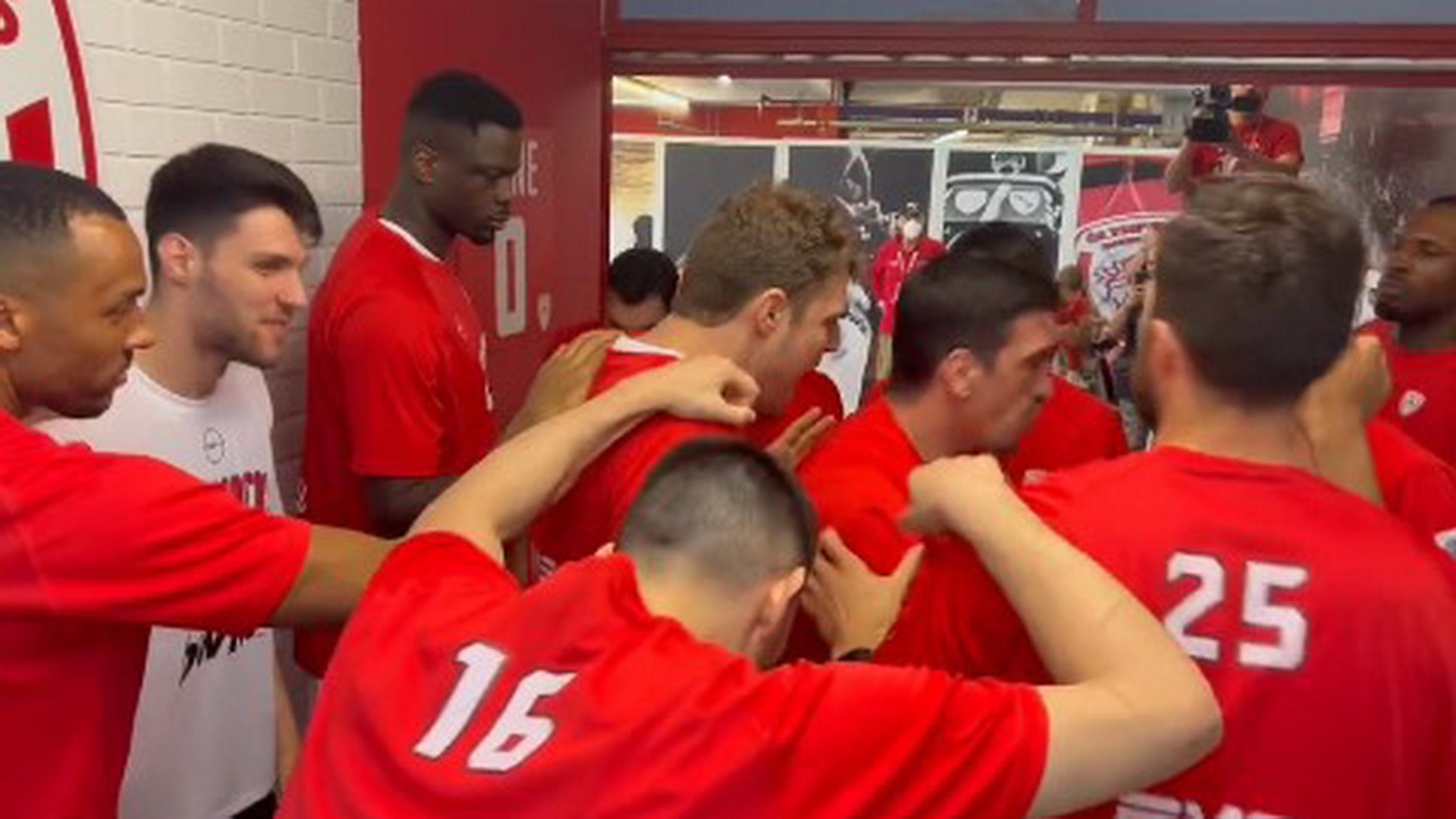 Όπως (σχεδόν) σε κάθε "ερυθρόλευκο" τελετουργικό, πριν την είσοδο των παικτών του Ολυμπιακού στο παρκέ, ο Σάσα Βεζένκοβ ΄δίνει το σύνθημα και οι υπόλοιποι την... πέφτουν στον Γιαννούλη Λαρεντζάκη, κάτι που συνέβη πριν την έναρξη και του 3ου τελικού της Basket League απέναντι στον Παναθηναϊκό.