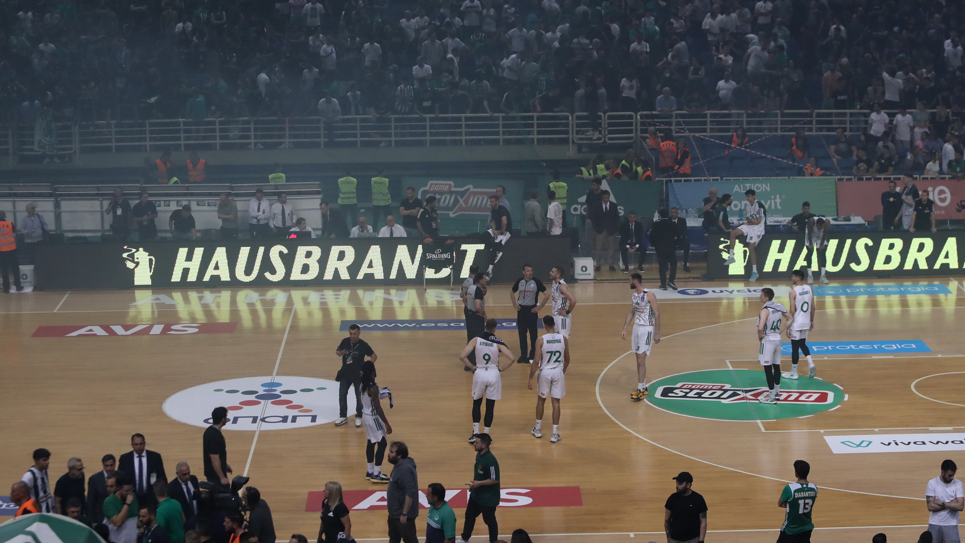 Την προσωρινή διακοπή της αναμέτρησης, 2'46'' πριν το φινάλε του τρίτου δεκαλέπτου διέταξε η διαιτητική τριάδα, μετά την ρίξη καπνογόνων και αντικειμένων από πλευράς των οπαδών του Παναθηναϊκού.