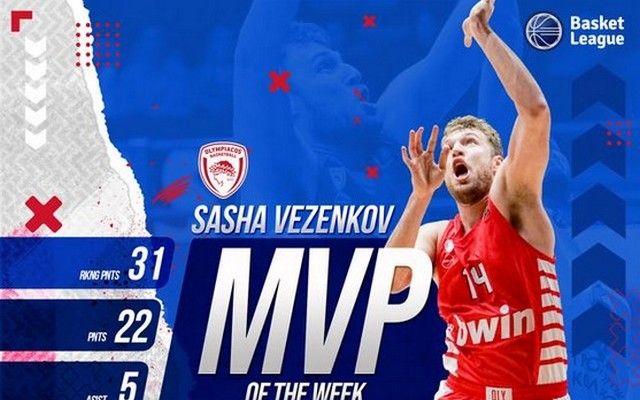 Δε σταματά να συλλέγει διακρίσεις ο Σάσα Βεζένκοβ, με τον φόργουορντ του Ολυμπιακού να αναδεικνύεται πολυτιμότερος παίκτης της 7ης αγωνιστικής του πρωταθλήματος, αφού συγκέντρωσε 31 μονάδες στο σύστημα αξιολόγησης.