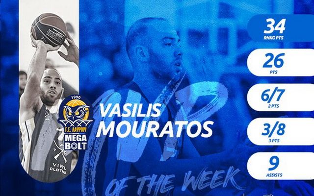 Ο Βασίλης Μουράτος ήταν ο καταλύτης της νίκης του Λαυρίου στην Νίκαια επί του Ιωνικού, με τον αρχηγό των «μεταλλωρύχων» να κάνει ρεκόρ καριέρας με 36 πόντους, έχοντας παράλληλα εννέα ασίστ, τρία κλεψίματα και 34 βαθμούς στο σύστημα ranking, αριθμοί που του χάρισαν το βραβείο του πολυτιμότερου παίκτη της εβδομάδας στην Basket League.
