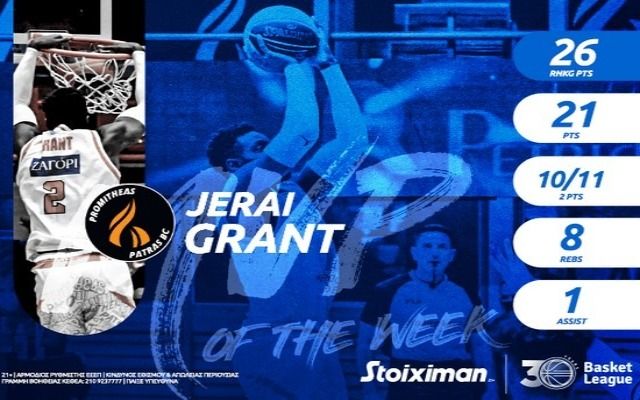 Ο άσος του Προμηθέα, Τζεράι Γκραντ ανακοινώθηκε ως ο MVP της 18ης αγωνιστικής της Basket League.