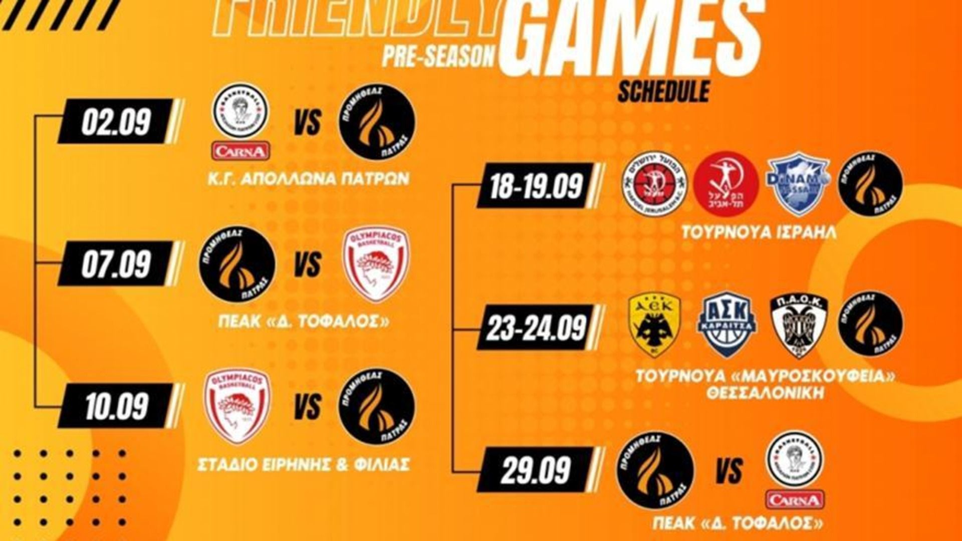 Το πρώτο φιλικό παιχνίδι του Προμηθέα θα διεξαχθεί στην Περιβόλα, με αντίπαλο τον συμπολίτη Απόλλωνα (2/9). Εν συνεχεία, θα ακολουθήσουν δύο πολύ δυνατά ματς κόντρα στον Ολυμπιακό, το πρώτο στην Πάτρα (7/9) και το επόμενο στο ΣΕΦ (10/9). Έπειτα, οι «Προμηθείς» θα βρεθούν σε φιλικό τουρνουά στο Ισραήλ, με πολύ δυνατούς αντιπάλους, την Χάποελ Τελ Αβίβ, την Χάποελ Ιερουσαλήμ και τη Ντινάμο Σάσαρι (18-19/9). Πέντε ημέρες αργότερα (23-24/9), το συγκρότημα του Ηλία Παπαθεοδώρου θα παίξει στα «Μαυροσκούφεια» στη Θεσσαλονίκη, με αντιπάλους την ΑΕΚ, τον ΠΑΟΚ και την Καρδίτσα. Στα τέλη του μήνα (29/9), ο Προμηθέας θα αγωνιστεί στο ¨Δ.Τόφαλος¨, στην πρόβα τζενεράλε για τη νέα χρονιά, κόντρα στον Απόλλωνα.