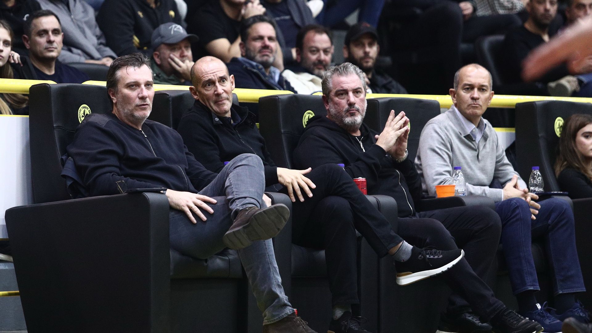 Οι διοικητικοί ηγέτες των πρωταθλητών, μαζί με τον Νίκο Λεπενιώτη, βρίσκονται στο κλειστό του «Αγ. Θωμά», για να παρακολουθήσουν από κοντά τις προσπάθειες του Γιώργου Μπαρτζώκα και των παικτών του.