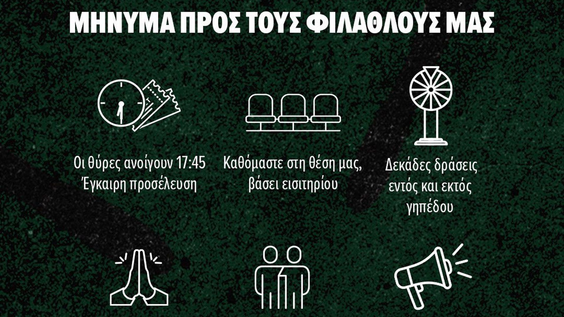 Το δικό της μήνυμα στους οπαδούς του Παναθηναϊκού ενόψει του ντέρμπι με τον Ολυμπιακό για τη 15η αγωνιστική της Basket League έστειλε η πράσινη ΚΑΕ, με τους ιθύνοντες των γηπεδούχων να ενημερώνουν για το άνοιγμα των θυρών του ΟΑΚΑ στις 17:45, ήτοι 2μιση ώρες πριν την έναρξη του αγώνα.