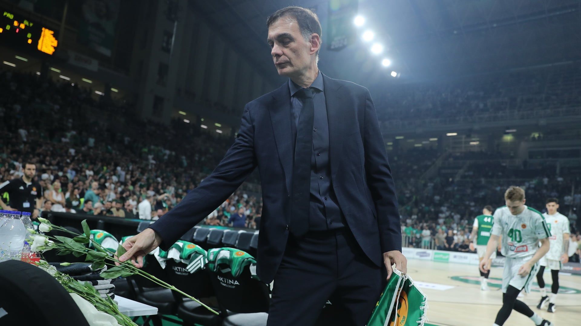 Ο Γιώργος Μπαρτζώκας και όλοι οι παίκτες των ερυθρόλευκων άφησαν ένα τριαντάφυλλο στην θέση του φροντιστή του Παναθηναϊκού και μια ανθοδέσμη προς τιμήν του προέδρου του Παναθηναϊκού.