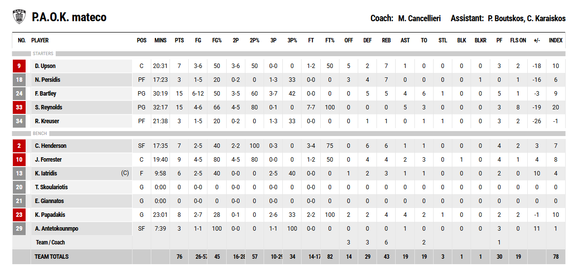 Ξεχώρισαν: Για τους γηπεδούχους ο Βαρνάντο με 14 πόντους και ο Γουόκερ με 16 πόντους και 7 ασσίστ. Για τον ΠΑΟΚ ξεχώρισε ο Μπάρτλει με 15 πόντους, 5 ριμπάουντ και 5 ασσίστ και ο Ρέινολντς με 15 πόντους και 5 ασσίστ.