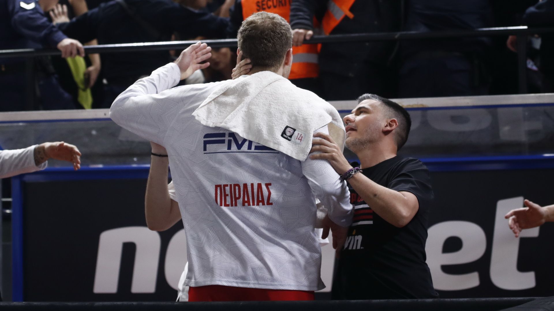 Συγκεκριμένα, τρία λεπτά πριν το φινάλε του ημιχρόνου της αναμέτρησης, οι οπαδοί του Πανιωνίου που βρίσκονται πίσω από τον πάγκο του Ολυμπιακού, άρχισαν να βρίζουν τα μέλη της «ερυθρόλευκης» αποστολής και συγκεκριμένα, αρχικά τον Σάσα Βεζένκοβ και εν συνεχεία τον Κώστα Παπανικολάου, αλλά και τον Γιώργο Μπαρτζώκα. Μάλιστα, Βεζένκοβ και Παπανικολάου εξηγούσαν στον Φάνη Χριστοδούλου, που έσπευσε στο σημείο, τι ακριβώς συνέβη, ο Μπαρτζώκας κοιτούσε αμίλητος την κερκίδα, ενώ΄, όπως ενημέρωσε η ομάδα του Πειραιά, οπαδός των γηπεδούχων έφτυσε τον Βεζένκοβ!