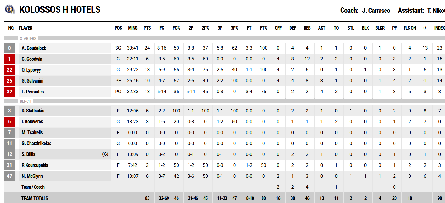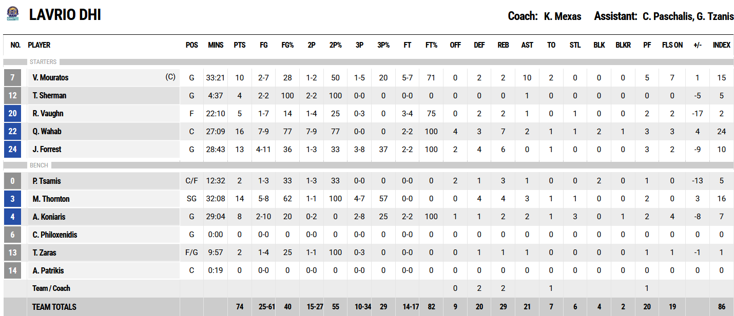 Ξεχώρισαν: Από πλευράς Λαυρίου πολύ καλό παιχνίδι έκανε ο Κούντους Γουάχαμπ με 16 πόντους και 7 ριμπάουντ, ενώ από τον Κολοσσό ο Ολεξάντερ Λίποβι με 13 πόντους και 6 ριμπάουντ.