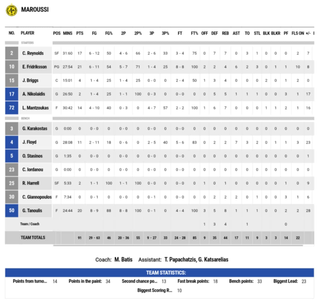 Η μεγαλύτερη διαφορά: Οι 23 πόντοι διαφοράς για το Μαρούσι (91-68) στο 40' λεπτό