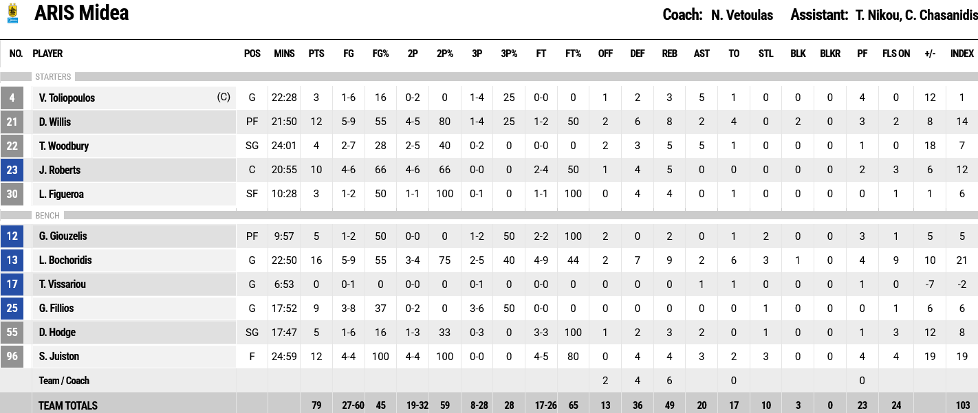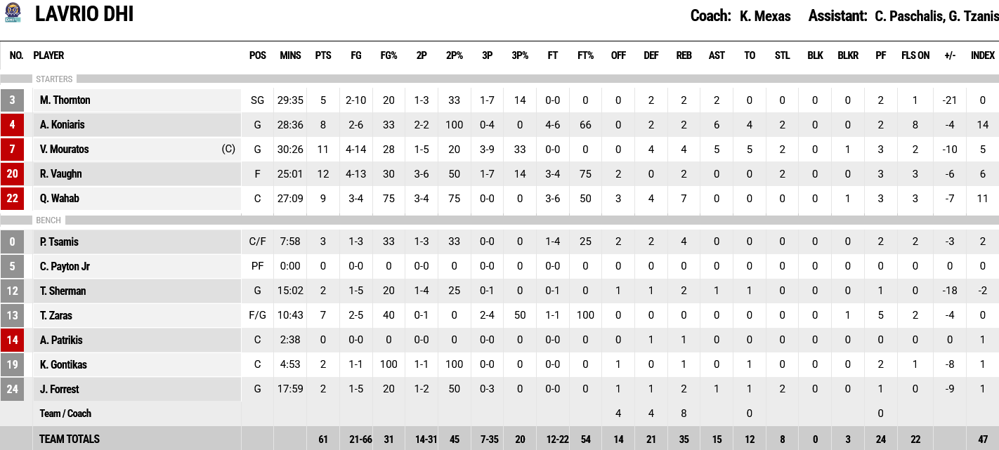 Ξεχώρισαν: Από τον Άρη σκόραραν ο Τζούστον και ο Γουίλις με 12 πόντους. Από το Λαύριο διακρίθηκαν ο Βον και ο Μουράτος με 12 και 11 πόντους.
