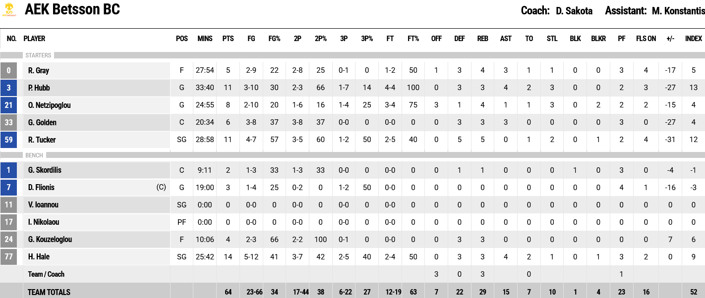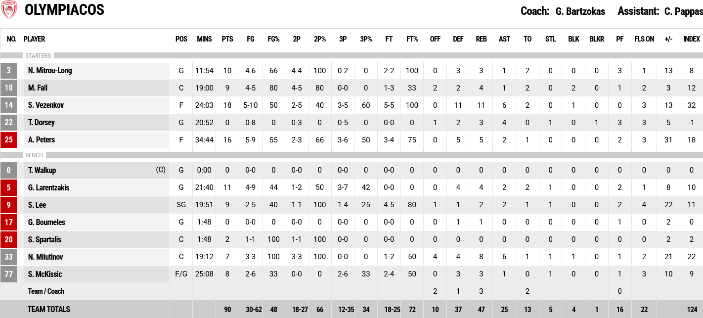 Ξεχώρισαν: «Καυτός» σε ακόμα ένα ματς ο Πίτερς με 16 πόντους, με τον Λαρεντζάκη να έχει 11 πόντους και τον Μήτρου – Λονγκ 10. Από πλευράς ΑΕΚ, ο Χέιλ είχε 14 πόντους και οι Χαμπ και Τάκερ από 11 έκαστος.