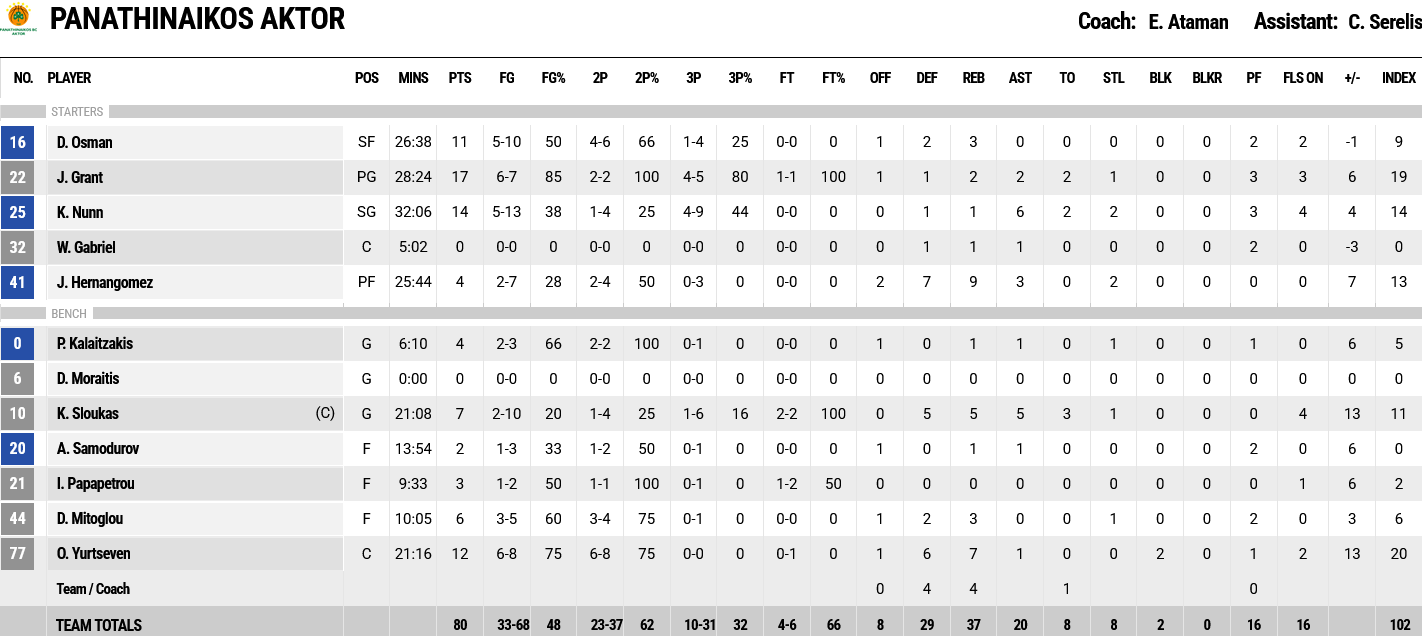 Ξεχώρισαν: Γκραντ με 17 πόντους, Ναν με 14 πόντους και έξι ασίστ, αλλά και Γιούρτσεβεν, με 12 πόντους και επτά ριμπάουντ, ήταν οι κορυφαίοι του Παναθηναϊκού. Από πλευράς Ολυμπιακού, εκτός του Βεζένκοβ, ξεχώρισε ο Φαλ με 15 πόντους και επτά ριμπάουντ, ενώ Φουρνιέ και Πίτερς είχαν 12 και 11 πόντους αντίστοιχα.
