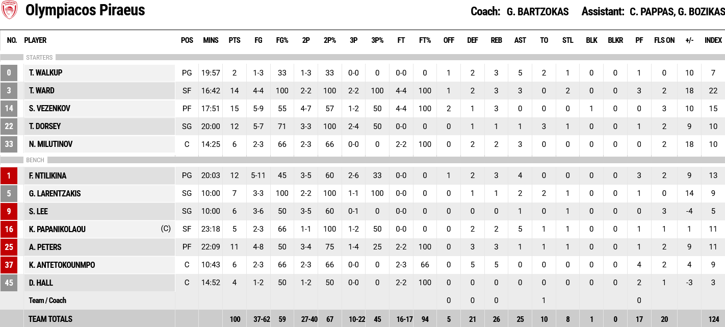 Ξεχώρισαν: 15 πόντους σημείωσε ο Βεζένκοβ, 14 ο πολύ καλός Γουόρντ, ενώ από 12 είχαν οι Ντόρσεϊ και Νιλικίνα, με τον Γάλλο γκαρντ να έχει και τρία ριμπάουντ με τέσσερις ασίστ. Για το Μαρούσι, από 15 πόντους είχαν οι Ρέινολντς και Γουίλιαμς.