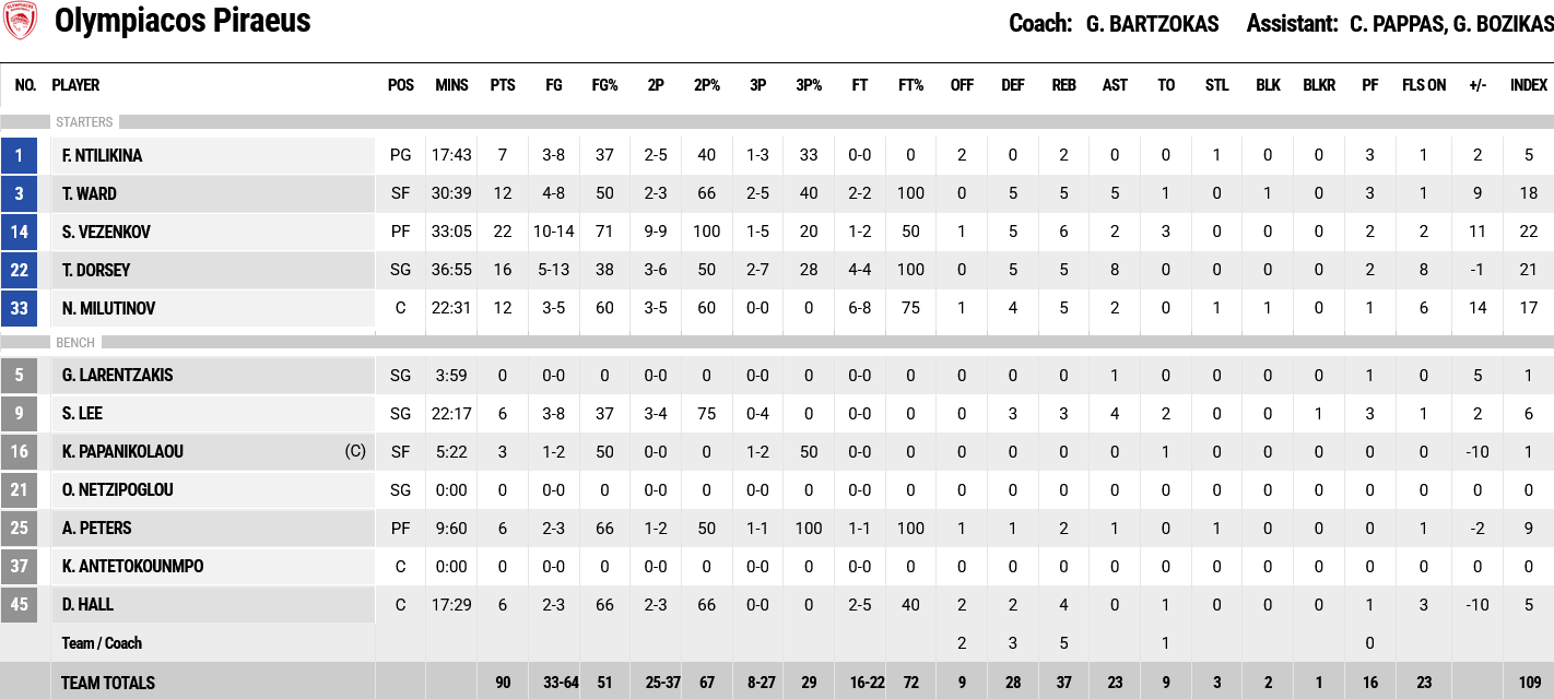 Ξεχώρισαν: Ακόμα ένα εξαιρετικό παιχνίδι από τον Ντόρσεϊ, με 16 πόντους, πέντε ριμπάουντ και οκτώ ασίστ, με τους Γουόρντ και Μιλουτίνοβ να έχουν από 12 πόντους έκαστος. Για τον Παναθηναϊκό, εκπληκτικός ήταν ο Σορτς με 19 πόντους, με τον Τολιόπουλο να… ντύνεται Ναν για ένα δεκάλεπτο, όπου και πέτυχε 14 πόντους.