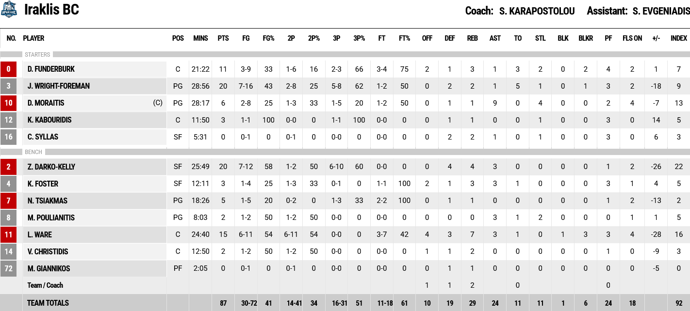 Ξεχώρισαν: Στους 27 πόντους με… σβηστές μηχανές, σταμάτησε ο Σάσα Βεζένκοβ, με τον Φουρνιέ να… ξεμπουκώνει με 14 πόντους. Για τον Ηρακλή, Ράιτ – Φόρμαν και Ντάρκο – Κέλι είχαν από 20 πόντους έκαστος, σκοράροντας μαζί 11/18 τρίποντα!