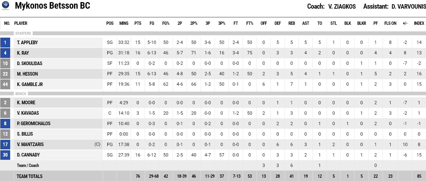 Ξεχώρισαν: Εξαιρετικός για ακόμα ένα ματς ο Σίλβα, με 16 πόντους και οκτώ ριμπάουντ. Για την Μύκονο, Ρέι και Κάναντι είχαν από 16 πόντους και Χέσον με Άπλμπι από 15.