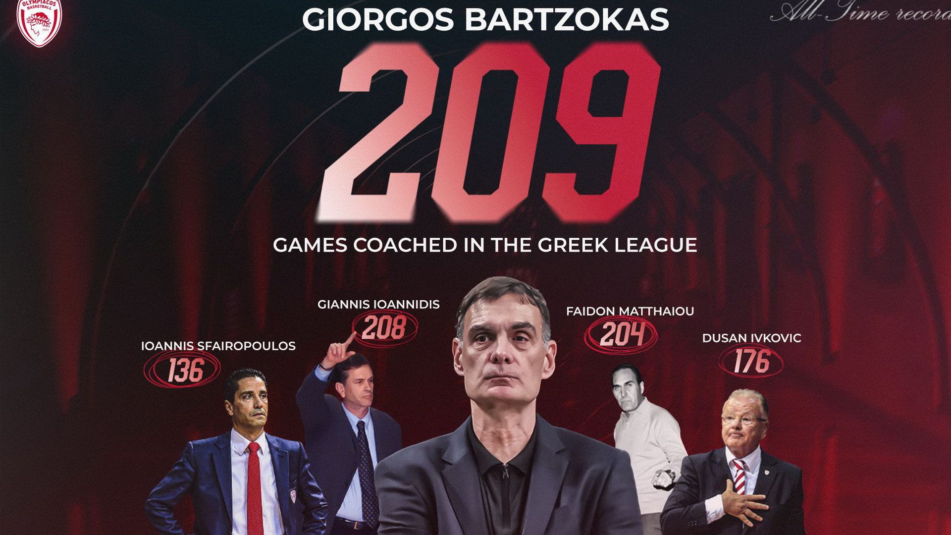 Ο Γιώργος Μπαρτζώκας συνεχίζει να γράφει ιστορία στο τιμόνι του Ολυμπιακού, καθώς, στο παιχνίδι με τον Κολοσσό, ο προπονητής των πρωταθλητών Ελλάδας συμπλήρωσε 209 αγώνες στον «κόκκινο» πάγκο, όντας πρώτος στην σχετική λίστα, ξεπερνώντας τον Γιάννη Ιωαννίδη.
