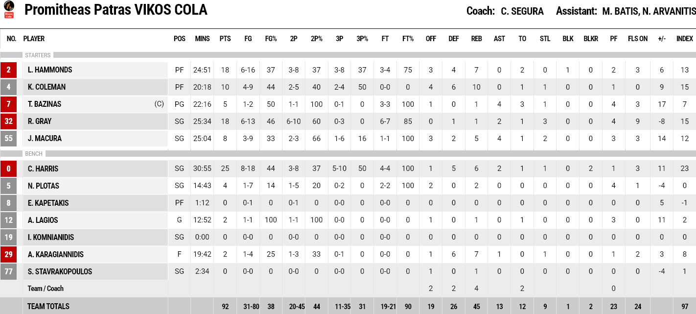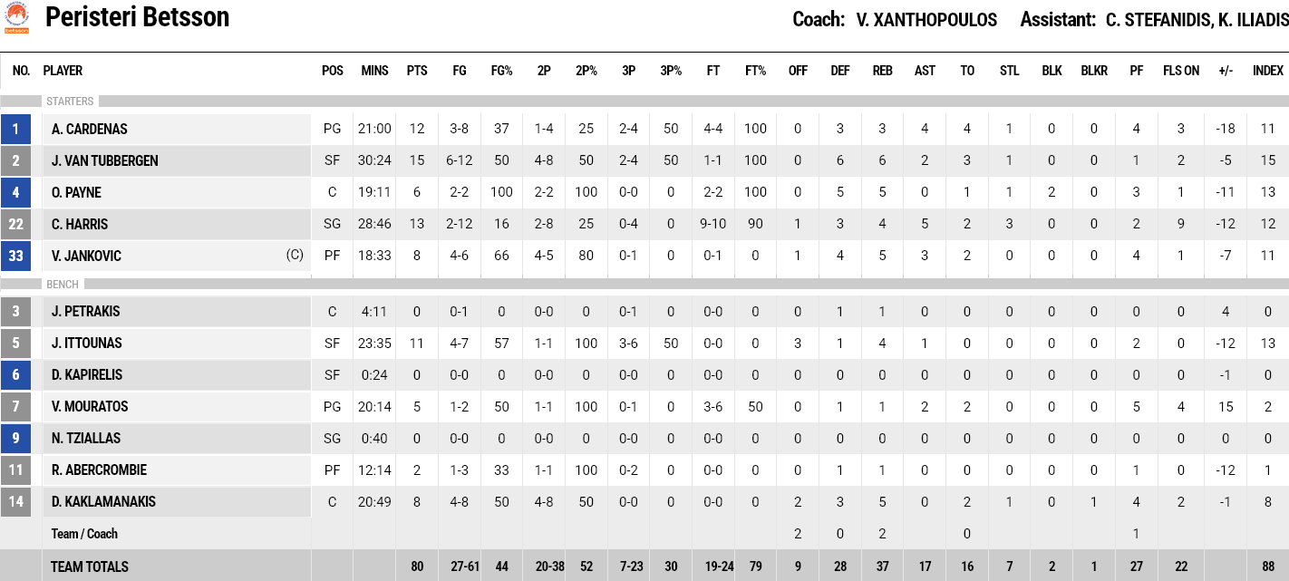 Ξεχώρισαν: Γκρέι και Χάμοντς σημείωσαν από 18 πόντους έκαστος, ενώ ο Κόουλμαν έκανε double – double με 10 πόντους και ισάριθμα ριμπάουντ. Για το Περιστέρι, ο Βαν Τούμπεργκερν είχε 15 πόντους.