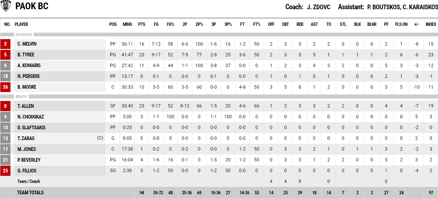 Ξεχώρισαν: Καθοριστικός ο Άπμπλι με 19 πόντους και επτά ασίστ, με τους Χέσον και Μουρ να έχουν 16 και 15 πόντους αντίστοιχα. Για τον ΠΑΟΚ, ακόμα μία εντυπωσιακή εμφάνιση πραγματοποίησε ο Ταϊρί με 23 πόντους, όσους πέτυχε και ο Άλεν.