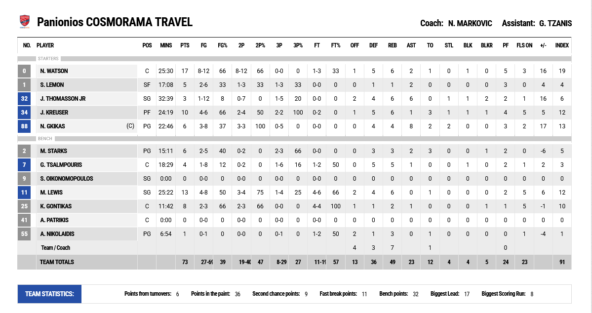 Ξεχώρισαν: 13 πόντους και 6 ριμπάουντ πρόσθεσε ο Λιούις, από πλευράς Ροδιτών ο Νίκολς ολοκλήρωσε το ματς με 18 πόντους και 9 ασίστ