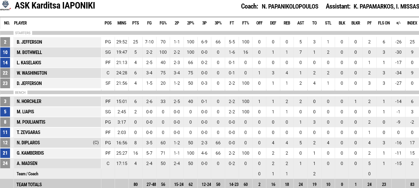 Ξεχώρισαν: Συνεχίζει τις… υψηλές πτήσεις ο Ντόρσεϊ, με 22 πόντους, ενώ ο Ταϊρίκ Τζόουνς, στο ντεμπούτο του, είχε 14 πόντους, τέσσερα ριμπάουντ και δύο ασίστ. Για την Καρδίτσα, ο Μπράντον Τζέφερσον είχε 25 πόντους και ο Καμπερίδης 16.