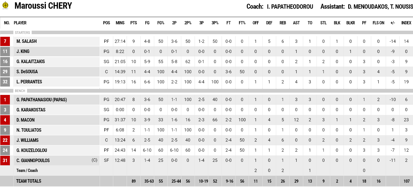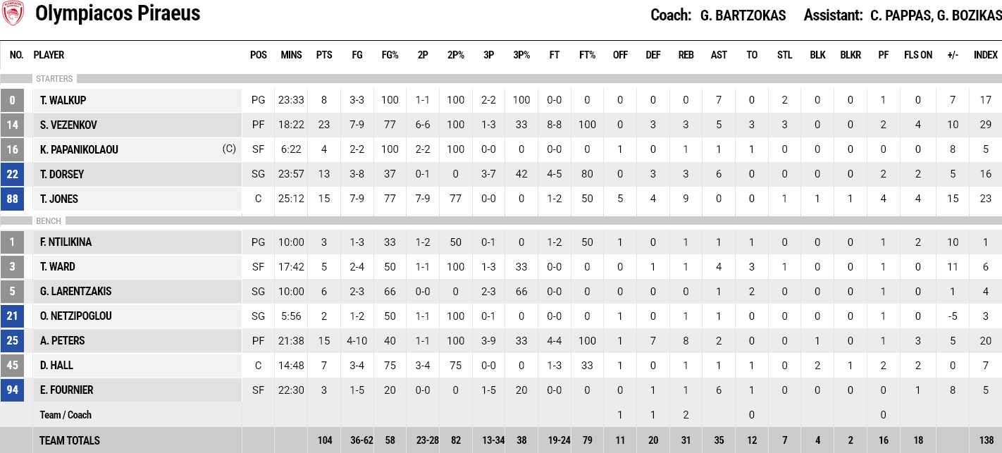 Ξεχώρισαν: Ταϊρίκ Τζόουνς και Άλεκ Πίτερς είχαν από 15 πόντους έκαστος, με εννέα και οκτώ ριμπάουντ αντίστοιχα, ενώ 13 πόντους και έξι ασίστ είχε ο Ντόρσεϊ. Για το Μαρούσι, 16 πόντους είχε ο Περάντες και 14 ο Κουζέλογλου.