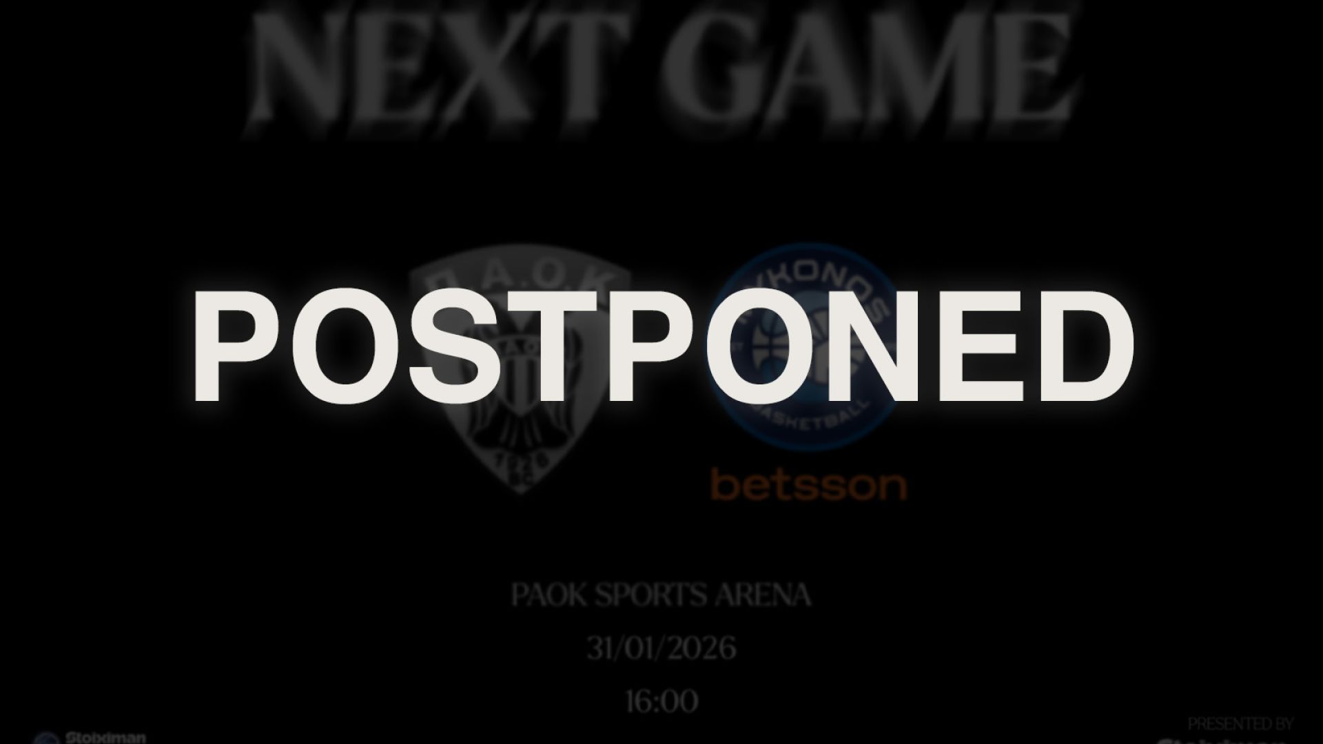 Μετά από αίτημα της ΚΑΕ ΠΑΟΚ, το οποίο έγινε δεκτό από την Stoiximan GBL, αναβάλλεται ο αγώνας ΠΑΟΚ – Μύκονος Betsson, που ήταν προγραμματισμένος να διεξαχθεί το Σάββατο 31 Ιανουαρίου 2026.