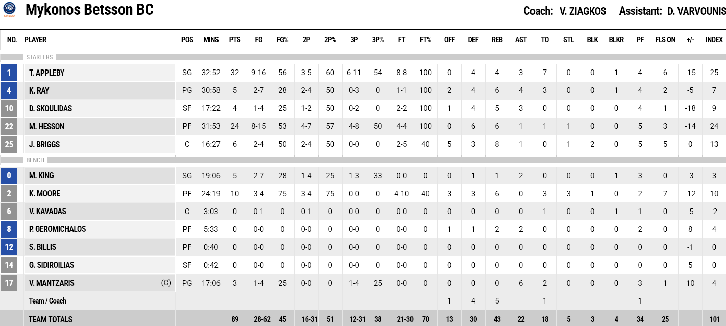 Ξεχώρισαν: Από τον Προμηθέα έβαλαν οι Μπαζίνας και Τάκερ από 19 και 14 πόντους αντίστοιχα. Από την Μύκονο επίσης είχαν ο Χέσον και ο Μουρ από 24 και 10 πόντους.