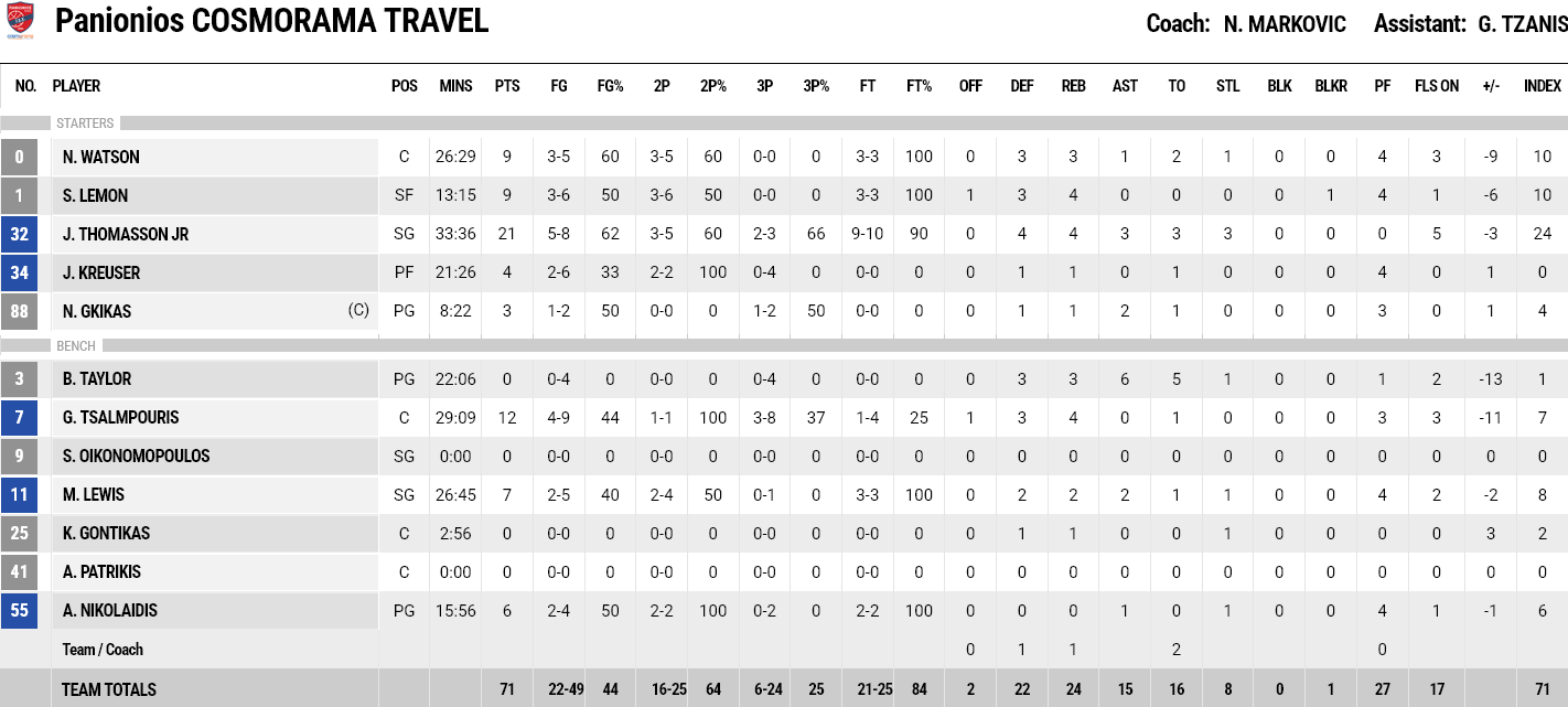 Ξεχώρισαν: 11 πόντους και οκτώ ριμπάουντ είχε ο Ταϊρίκ Τζόουνς, ενώ για τον Πανιώνιο, ο Τόμασον είχε 21 πόντους και ο Τσαλμπούρης 12.