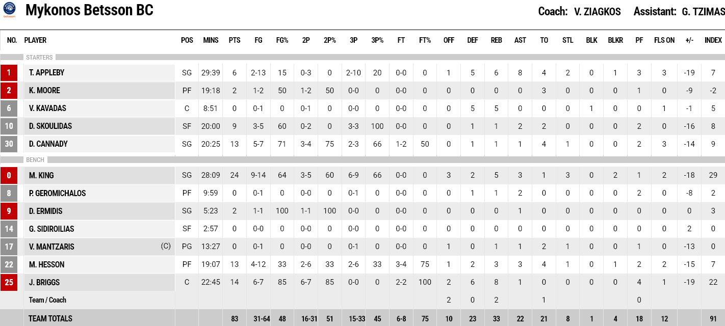 Ξεχώρισαν: Εξαιρετικός ο Νιλικινά με 19 πόντους και 5/7 τρίποντα, με τους Μόρις, Παπανικολάου και Πίτερς να προσθέτουν από 11 πόντους έκαστος. Για την Μύκονο, που κοίταξε στα μάτια τους πρωταθλητές για 20’, χωρίς όμως να καταφέρει να συνεχίσει στον ίδιο ρυθμό μέχρι το φινάλε, ο Κινγκ είχε 24 πόντους, ο Μπριγκς 14 και οι Κάναντι και Χέσον από 13 έκαστος.