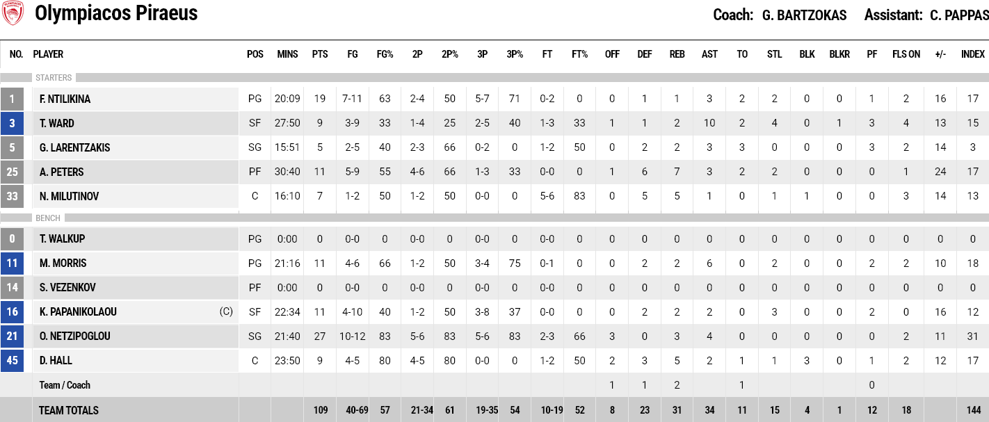 Η μεγαλύτερη διαφορά: +29 για τον Ολυμπιακό (109-80) στο 39’