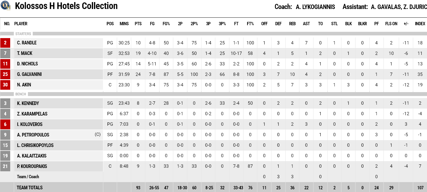 Ξεχώρισαν: «Διπλός» ο Γουίλιαμς με 17 πόντους και 11 ριμπάουντ, με τον Ρέινολντς να προσθέτει 19 πόντους. Για τον Κολοσσό, 24 πόντους και 10 ριμπάουντ είχε ο Γκαλβανίνι και 19 πόντους ο Μακ.