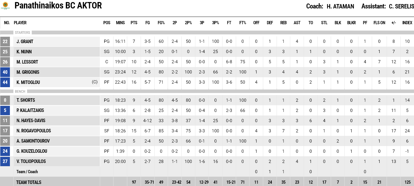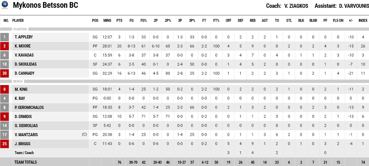 Ξεχώρισαν: Ακόμα μία σπουδαία εμφάνιση από τον Ρογκαβόπουλο με 15 πόντους, με τους Γκριγκόνις και Λεσόρ να ακολουθούν με 12 και 10 πόντους αντίστοιχα. Για την Μύκονο, ο Μουρ είχε 20 πόντους και ο Κάναντι 16.