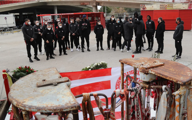 Ο αρχηγός των Πειραιωτών, Γιώργος Πρίντεζης, εναπόθεσε στεφάνι, ενώ όλα τα μέλη της ομάδας άφησαν από ένα κόκκινο τριαντάφυλλο.