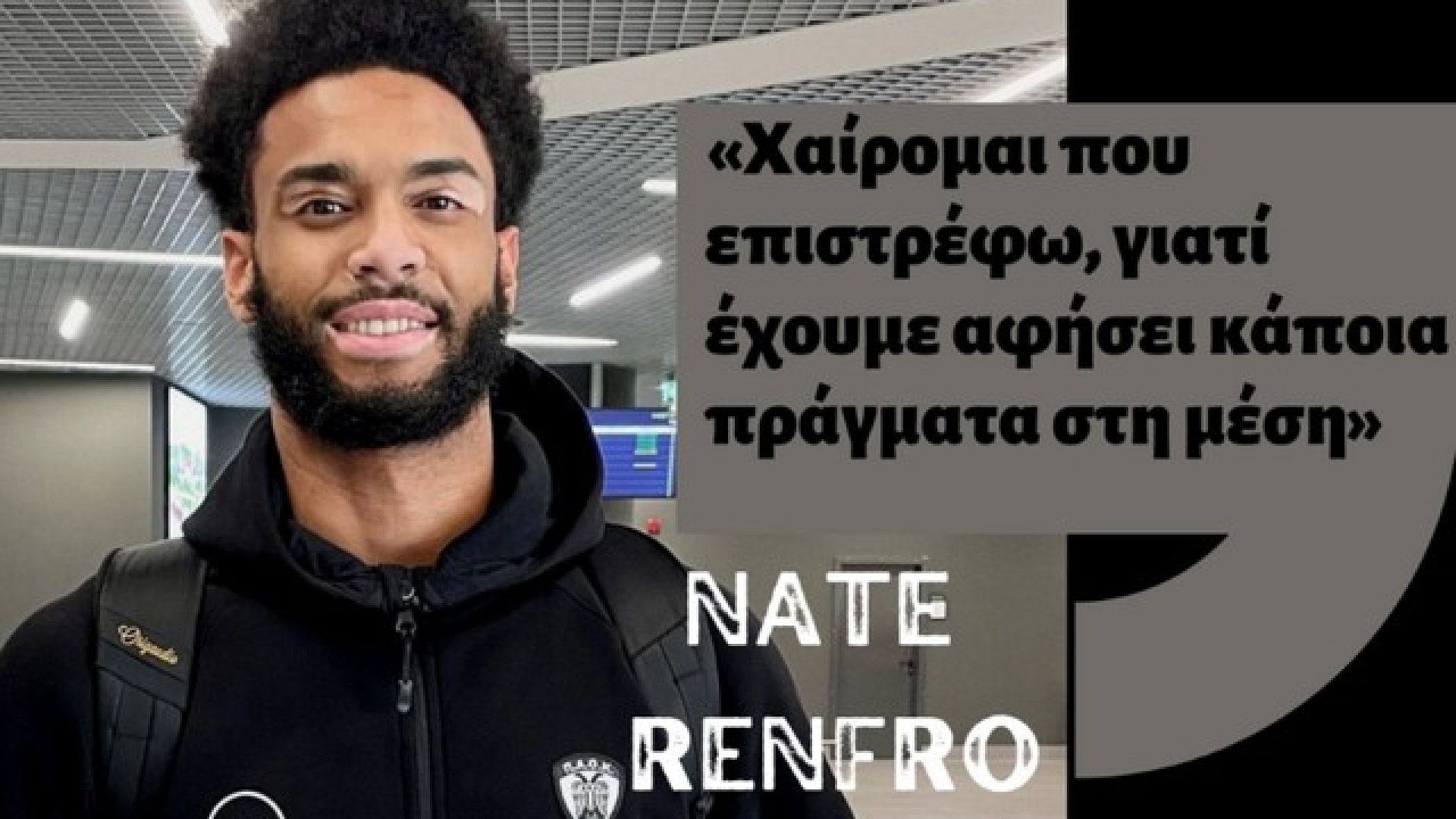 Ο Nate Renfro συστήθηκε στο Ελληνικό κοινό πριν από 100 ημέρες και στον αγώνα του ΠΑΟΚ στη Λάρισα. Στον ένα μήνα που έμεινε στην ομάδα, πρόλαβε να αγωνιστεί σε επτά συνολικά παιχνίδια και να αφήσει το στίγμα του. Ένας πολύ αθλητικός παίκτης, με εντυπωσιακές φάσεις σε άμυνα και επίθεση, αλλά και αδυναμία στις ελεύθερες βολές.
