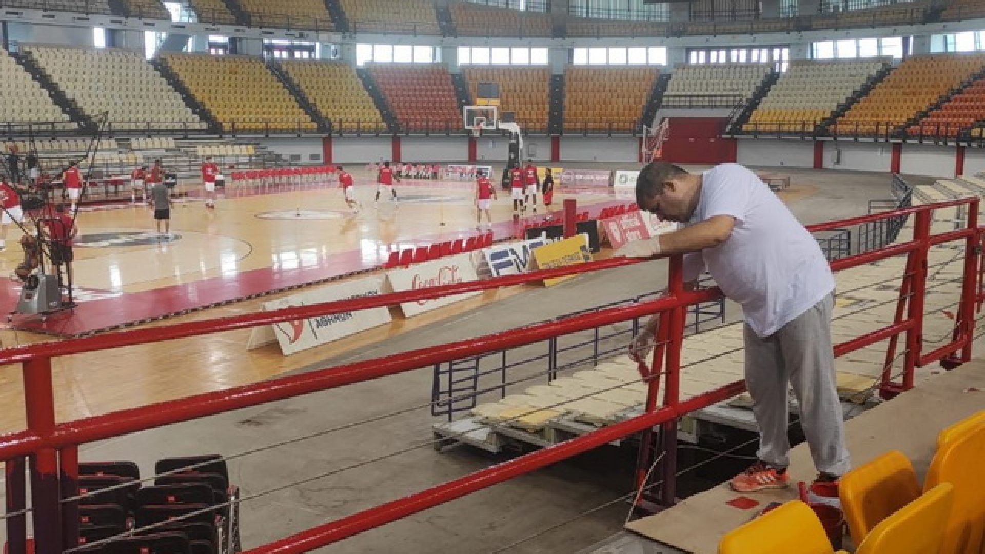 Συγκεκριμένα, οι εργαζόμενοι του Σταδίου πραγματοποιούν βάψιμο σε ολόκληρη την κεντρική σάλα του ΣΕΦ, με το ερυθρόλευκο χρώμα να κυριαρχεί, ενώ συνεχίζονται και οι βελτιωτικές εργασίες στις κερκίδες.